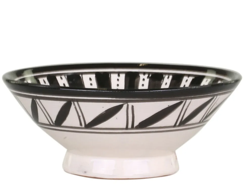 Die Marrakech Schale erreicht einen Durchmesser von 16 cm, eine Höhe von 7 cm und ist mit einem kreativen Muster in französisch grau oder schwarz versehen. Das Design des Geschirrstücks aus Ton kann leicht abweichen und wird dadurch zum originellen Schmuckstück.