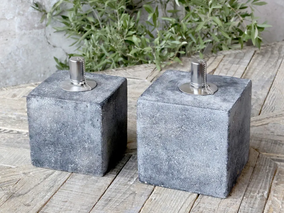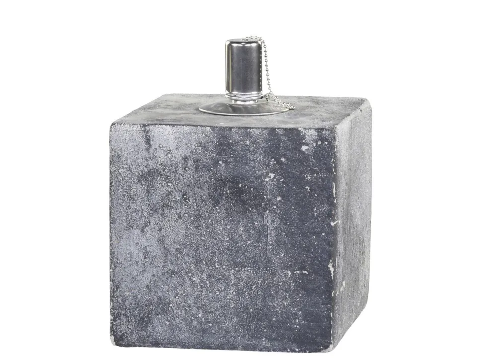 Dank ihrer kubischen Form und der rustikalen Oberfläche besitzt sie einen rohen Ausdruck, der einen perfekten Kontrast zur warmen, goldenen Flamme bildet, wenn die Lampe angezündet wird.