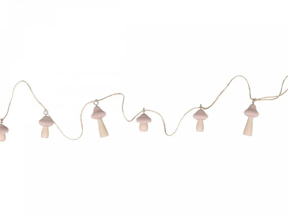 Die Girlande ist mit 6 Pilzen in der Farbe puder oder mokka bestückt, welche einen Hut aus Velours tragen. Ansonsten bestehen die dekorativen Pilze aus Holz und hängen an einer Juteschnur. Du kannst die Ranke beispielsweise hervorranged am Geländer befestigen oder dir einen Ast aussuchen, an der die Pilze dein Zuhause verspielt schmücken sollen.