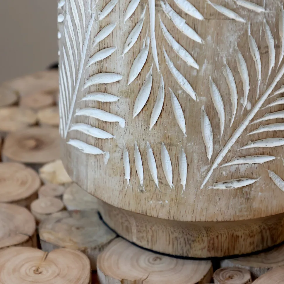 Dekorative Tischlampe, die deinen Raum in ein wunderschönes Licht hüllt. In den Holzfuß sind stilvolle Elemente geschnitzt.