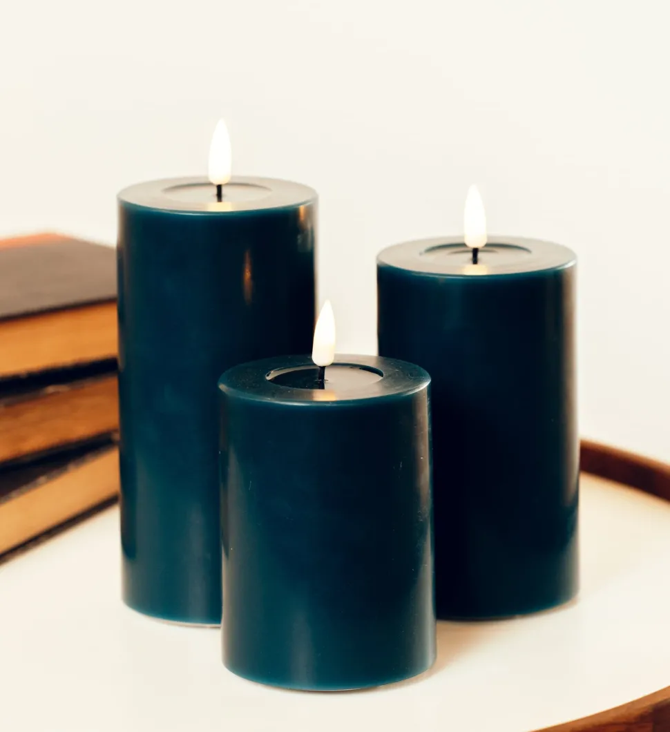 Diese wunderschöne blau-grüne LED Stumpenkerzen aus Kunstoff von DELUXE Homeart aus Dänemark hat eine täuschend echte Real Flame Flamme, die flackert.