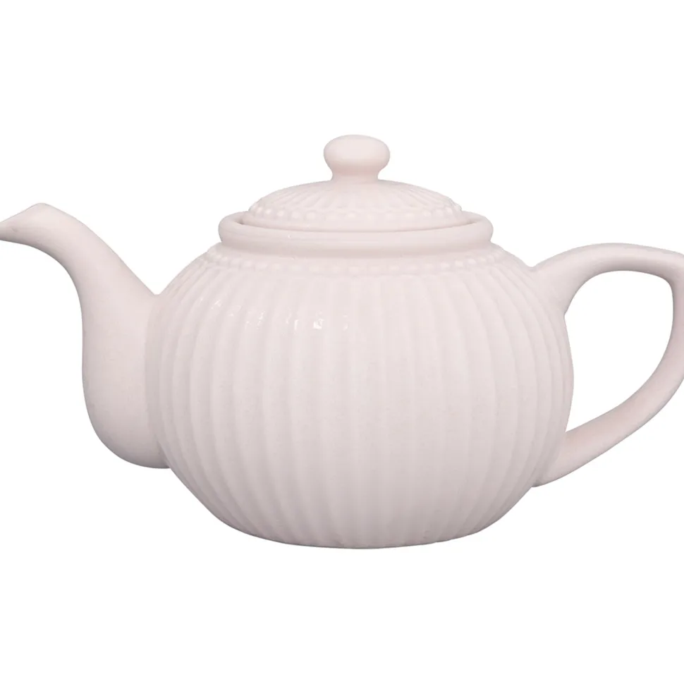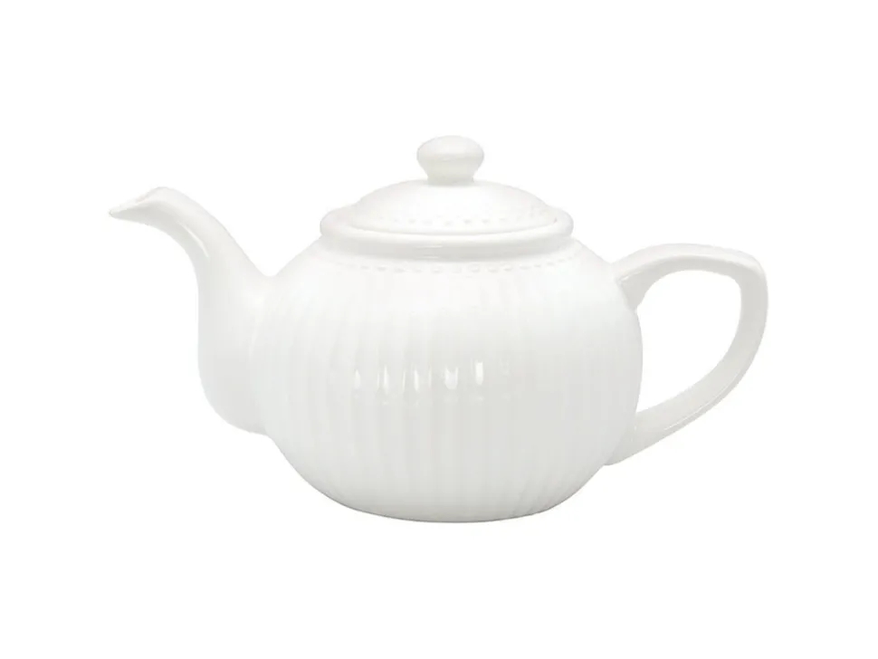 Diese schöne Teekanne aus der Serie Alice von GreenGate besteht aus Porzellan und besitzt einen sanften Rillenlook sowie eine dezente Perlenkante. Die Kanne ist in hellen Farben wie pale green, pale blue oder pale pink erhältlich, aber auch in schönen Blautönen wie sky blue, dark blue sowie in Grautönen, weiss, coral, grün und rot. Suche dir deine Lieblingsfarbe aus und gestalte einen farbigen oder dezent weissen Nachmittag bei einer gemütlichen Tasse Tee.