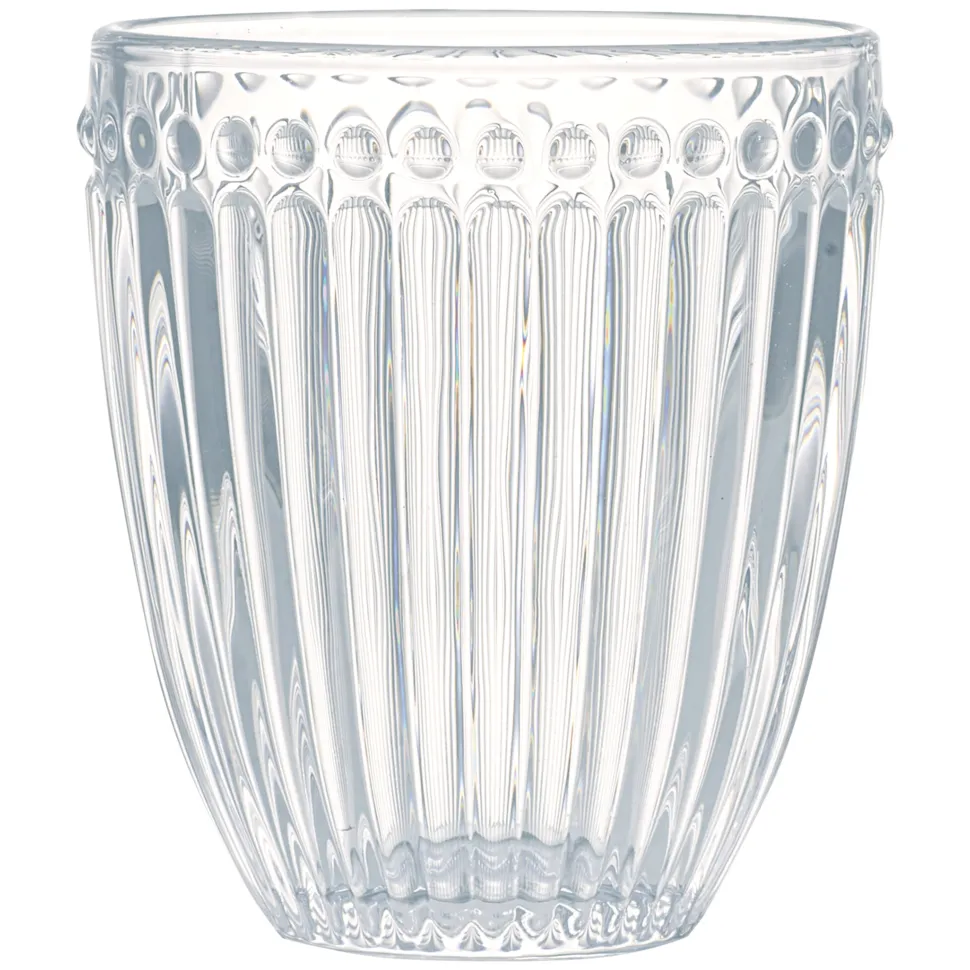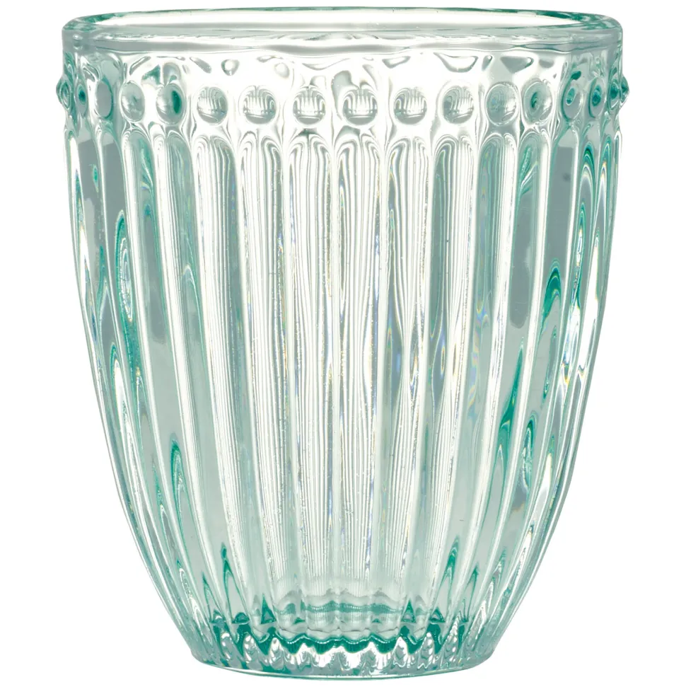 Nutze dieses handliche Wasserglas aus der Serie Alice von GreenGate Dänemark, um deinen Alltag zu verschönern. Die Rillen und der Perlenrand tragen zum besonderen Design, sowie der Grifffestigkeit des Trinkglases bei.