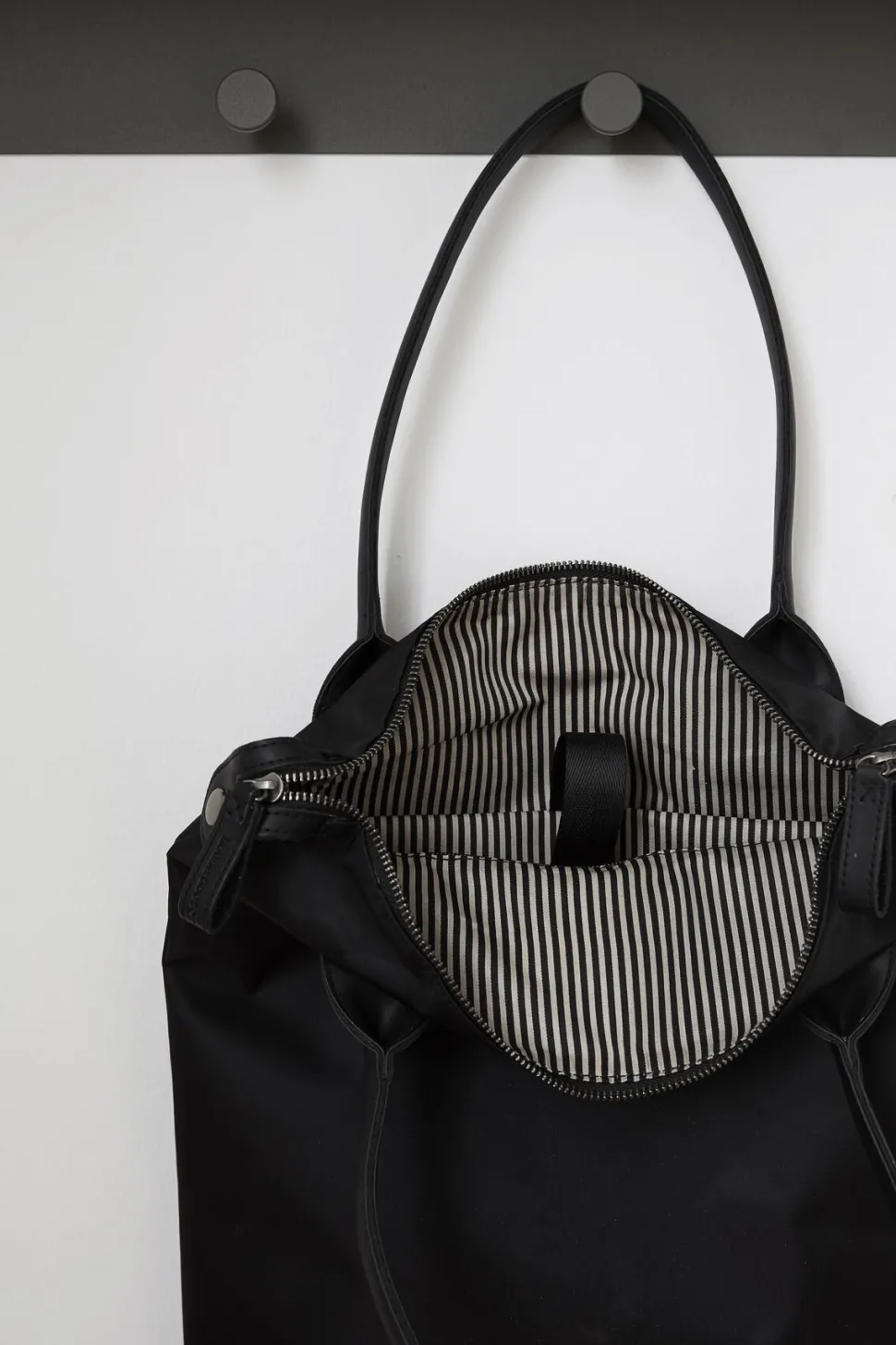 Die Tasche Travel von House Doctor überzeugt auf ganzer Linie. Durch das elegante Design der schwarzen Tasche, kann diese jeden Tag getragen werden und passt zu jedem deiner Outfits. Die Tasche punktet nicht nur in Sachen Optik, sie bietet auch ausreichend Platz für einen Laptop, deine Einkäufe und alle wichtigen Alltagsgegenstände. Die Tasche kann mit einem Reißverschluss geschlossen werden, geöffnet findet man ein schickes schwarz-weiß gestreiftes Innendesign vor.
