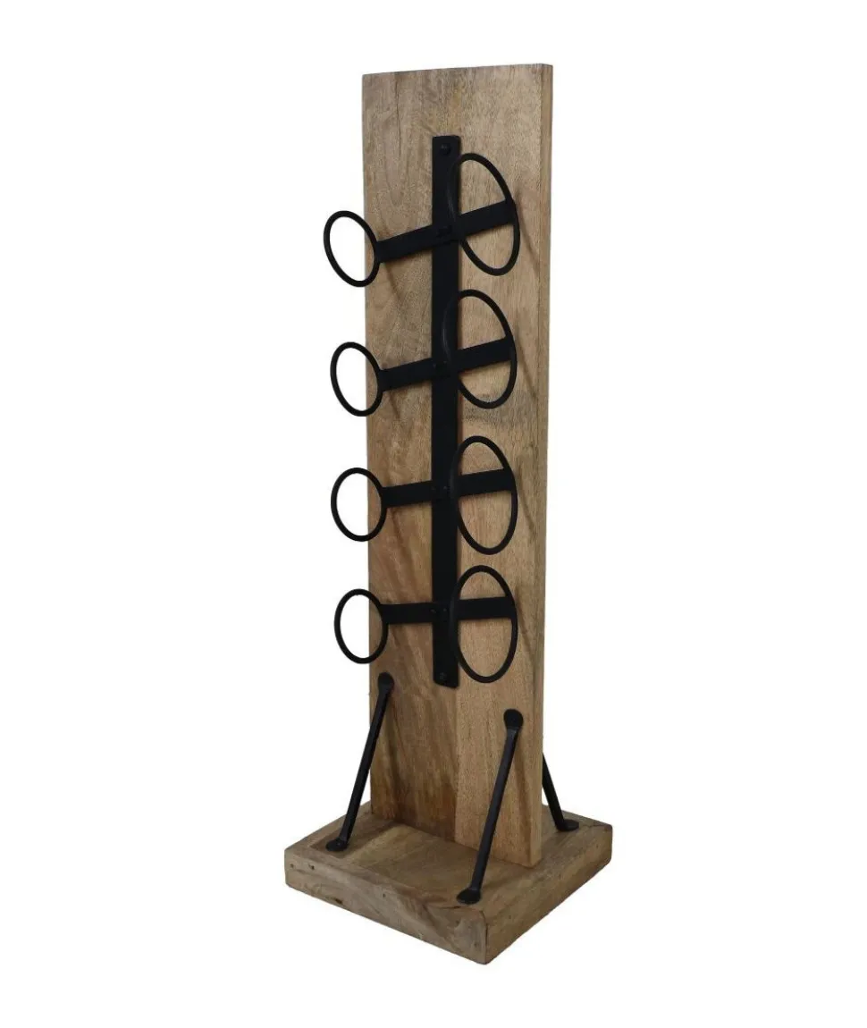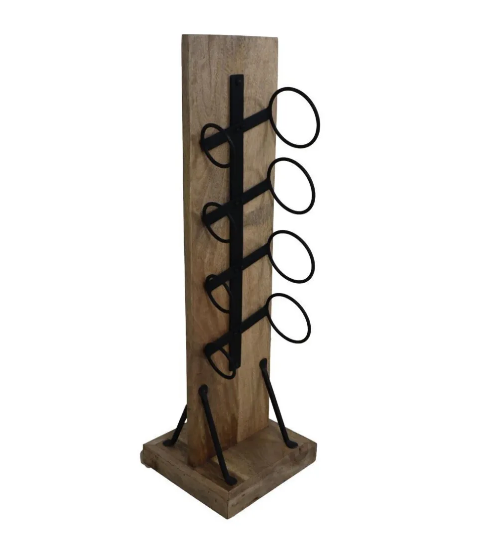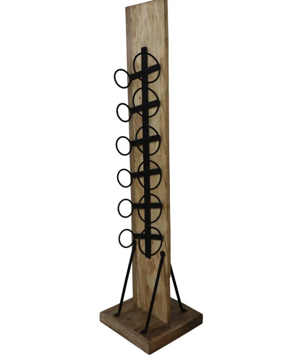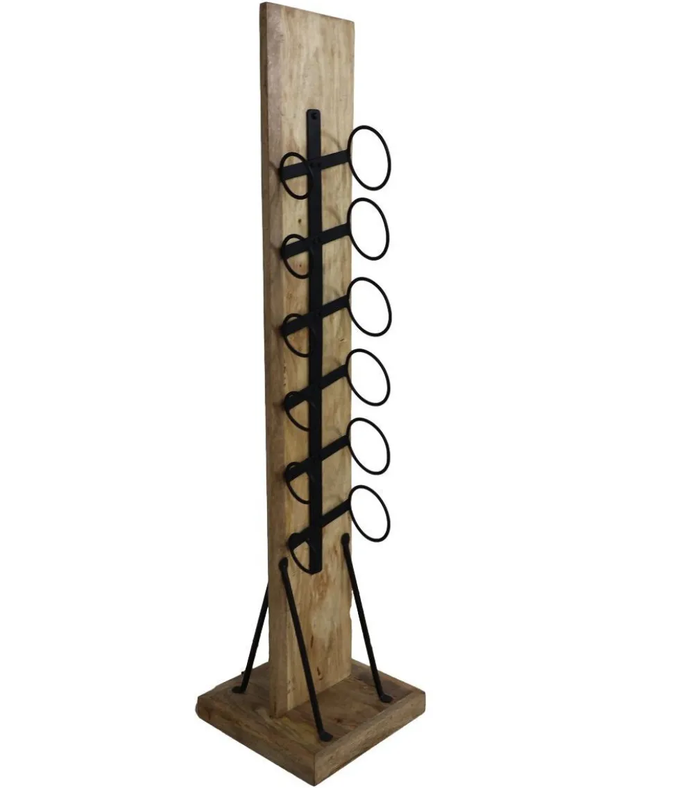 Dieses stehende Weinregal aus Mangoholz und Metall hat einen coolen Look.