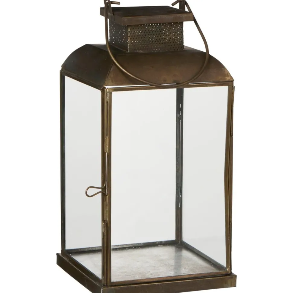 Metall, Glas. Die David-Laterne ist aus dunklem Metall gefertigt und mit Seiten aus klarem Glas sowie einem dekorativen Lochmuster oben versehen. Die quadratische Form und die glatte Metalloberfläche verleihen der Laterne einen minimalistischen und klassischen Ausdruck.
