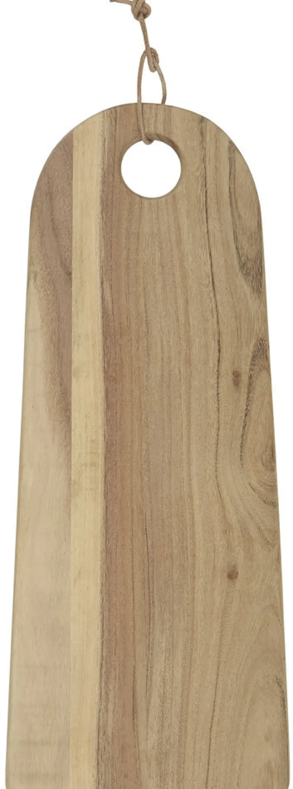 Ein wundervolles Schneidebrett aus naturbelassenem Akazienholz und einer hochwertigen Lederschnur.