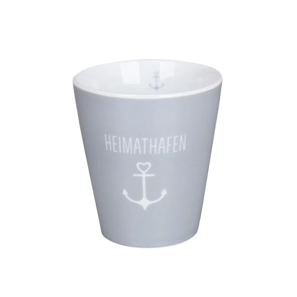Der Happy Mug Becher Heimathafen von Krasilnikoff ist ein wunderschöner Porzellanbecher aus Dänemark, der mit seinem maritimen Design und der hochwertigen Verarbeitung begeistert. Der Becher ist in grau gehalten und mit weißen Anker verziert, der an das Meer und den Hafen erinnern.