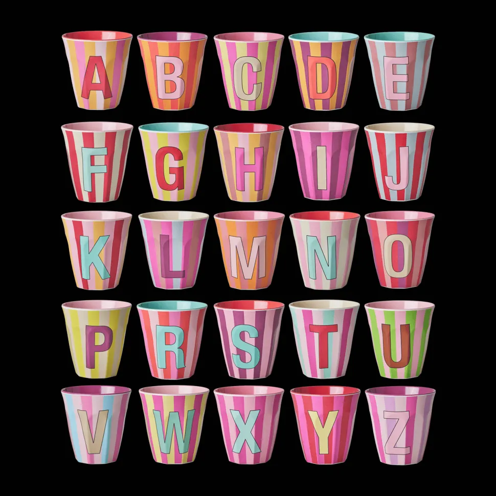Entdecke den beliebten Melamin Buchstabenbecher mit gestreiftem Design. Dieser Becher ermöglicht es dir, Buchstaben zu mixen und zu kombinieren, um Wörter zu bilden, da er in allen Buchstaben des Alphabets erhältlich ist. Jedes Familienmitglied kann seinen eigenen Becher mit dem Anfangsbuchstaben seines Namens haben.