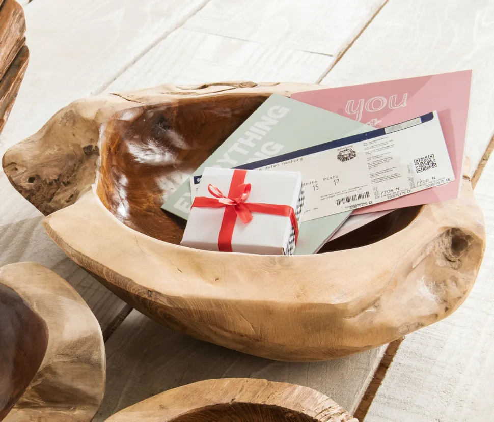Da es sich bei der Teakschale um ein Naturprodukt handelt kann es zu leichten Abweichungen in Form und Farbe kommen.